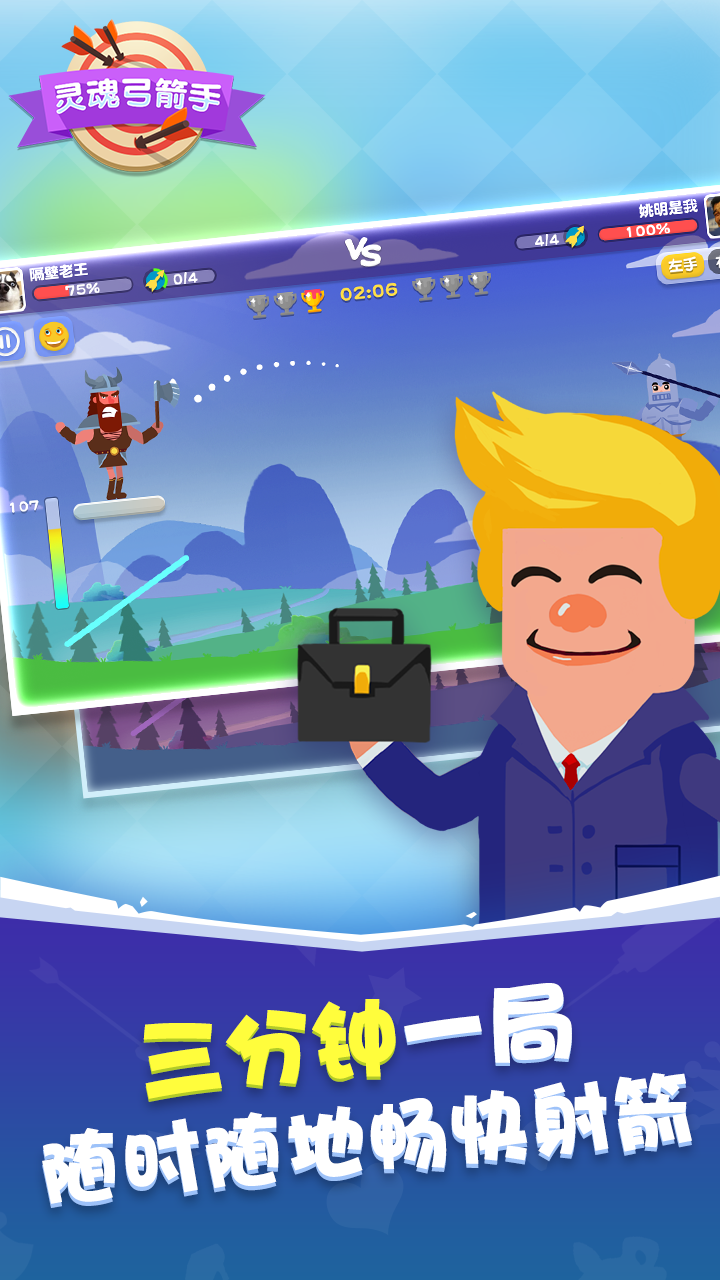 实时的弓箭手对战游戏,互相投掷武器攻击对方,击倒对方即可取胜。