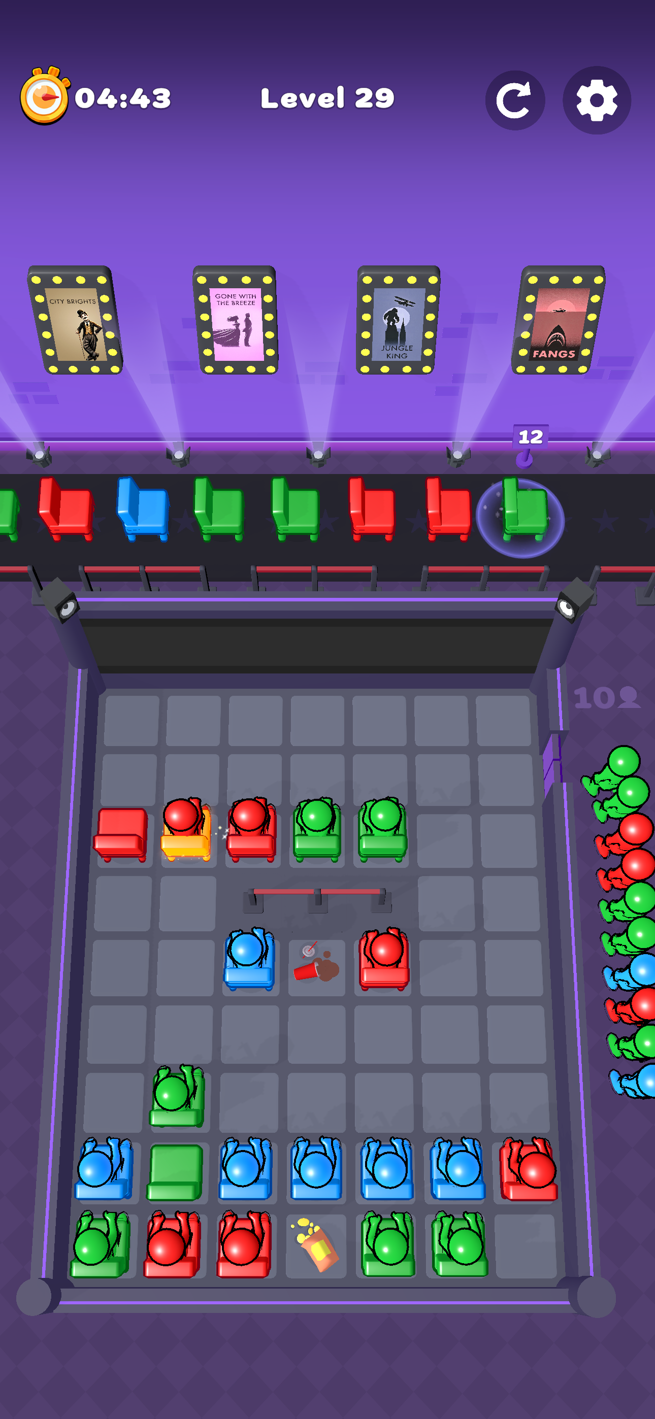 MorePlace chairs on the grid by tapping individual tiles or dragging your finger to create multiple seats in a row. Watch out for spilled popcorn and other tricky obstacles blocking your path. You cannot place chairs on those messy spots, so strategy is key. Creating a chain of correctly colored seats is only half the battle. The guests must be able to reach their chosen chairs without being trapped. Every tile placement matters, and if you isolate someone from their seat, you are on your way to a loss. Keep adjusting and perfecting your layout until each guest finds a perfect match. Complete your mission by seating all the guests waiting outside. If even one remains standing because of a poor arrangement, the round is over. The better your planning and problem-solving, the higher your chance of success. • Intuitive controls: Just tap or drag your finger to position chairs. • Puzzling obstacles: Overcome spilled snacks and other impediments that block chair placement. • Color-coded seating: Ensure every guest sits on the right chair for a win. • Pathfinding challenge: Guarantee a navigable route so guests can access their seats. • Increasing difficulty: More guests, more colors, and trickier obstacles await as you advance.