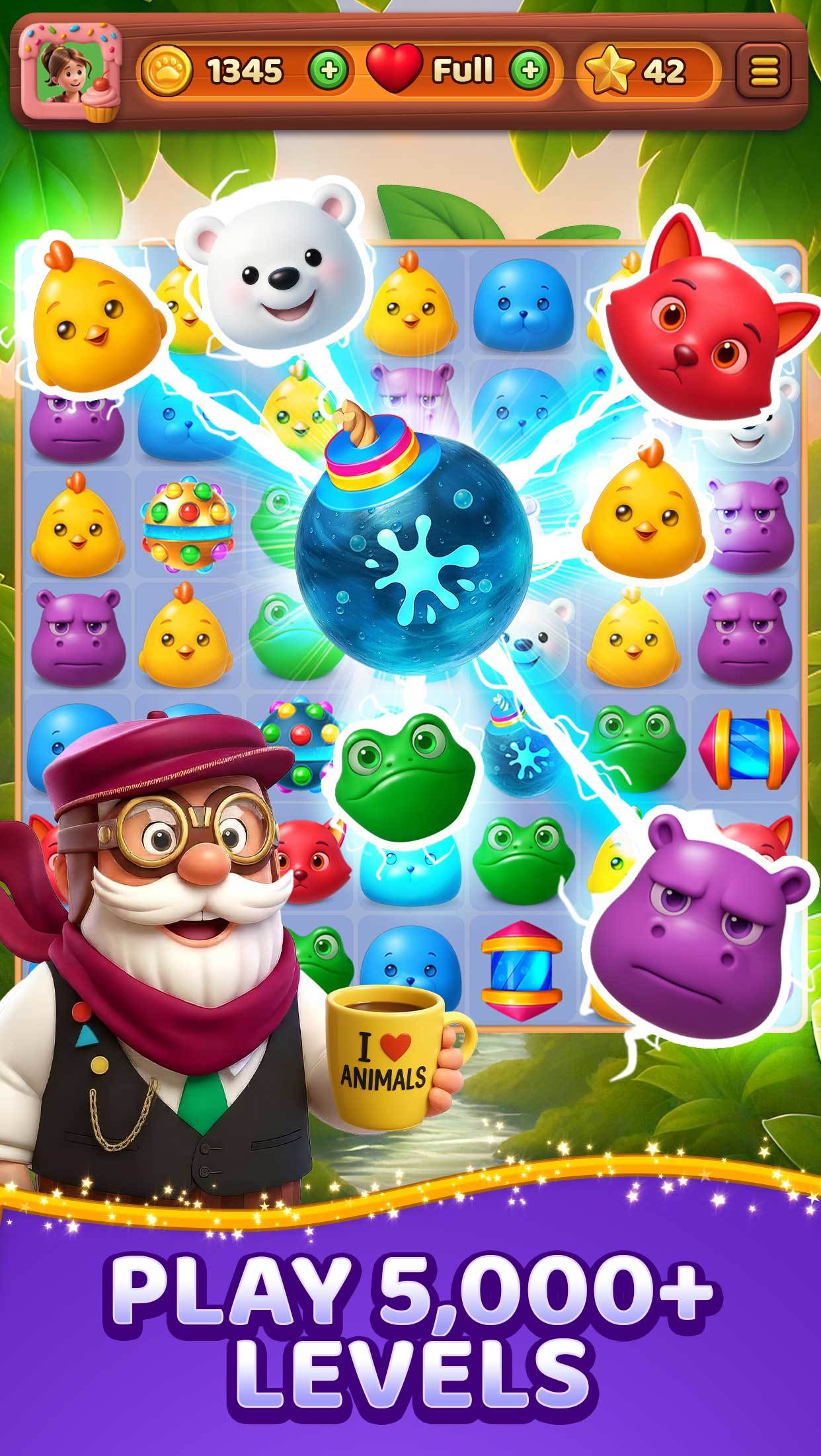 MoreSTOP DR. GEARHEART from destroying the wild! Join Captain, Ellie, and Fennec on a mission to rescue animals, rewild nature, and stop Dr. Gearheart’s greedy schemes — all through match‑3 puzzles packed with FUN & purpose! 🐾 Animal Crush: Match-3 Rescue is a cozy, heartwarming puzzle game where animals are the heroes. Match colorful tiles to free creatures trapped in overgrown forests, grasslands, oceans, and deserts. Every level brings you closer to rewilding the world — one rescued animal at a time. 🐼 WHY YOU'LL LOVE ANIMAL CRUSH • No ADs (unless you choose them!) • No Wi-Fi required — play anywhere, anytime • Stop villains, not animals — protect wildlife with every puzzle • Adorable creatures from forests, oceans, deserts, and tundras • Satisfying tile-matching with boosters, combos, and strategy • Relaxing, intuitive gameplay that’s fun at every age • Cozy vibes, soothing visuals, and lots of animals to love 🌱 PLAY WITH PURPOSE Help Captain and crew rewild the planet — from healing coral reefs to freeing grassland critters from mechanical traps. Every tap is a step toward restoring nature. 🎉 FEATURES • 1000+ hand-crafted levels and new content all the time • Daily events and surprise rewards to keep things fresh • Match to rescue — unlock real animal facts and reactions • Offline play with no pressure — perfect for winding down • Totally ad-free unless you want bonus rewards • Designed for animal lovers, puzzle fans, and cozy gamers alike Dr. Gearheart won’t stop… but neither will you. Download Animal Crush now — and help rewild the world, one puzzle at a time! 🐘🦊🐦