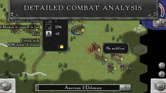 MoreRebels and Redcoats recreates the battlefields of the American Revolutionary War. The war began in 1775 when the American colonies rebelled against the British Empire, declaring their independence in 1776. In the following years, Britain tried to end the revolt and recapture the American territories. The rebels however had support from Europe, with France and Spain later joining the war as allies to their cause. A decisive American victory at Yorktown in 1781 broke the British resolve and was a catalyst in starting peace negotiations. The war ended in 1783 with the signing of the Treaty of Paris and global recognition of the sovereignty of the United States. Key Game Features ● 5 Mission 'Tutorial' Campaign. ● 4 Mission ‘Evolution' Campaign. ● 4 Mission ‘Nemesis' Campaign. ● All missions, apart from the tutorial, can be played as both sides. ● 37 different historical models representing 26 different unit types. ● Three classes of troop quality – Raw, Average and Veteran. ● New general quality mechanic, affecting command radius and leadership benefits. ● 14 different troop classes including infantry (line, grenadiers, guard, and militia), light infantry (and jägars), light cavalry (light dragoons and hussars), dragoons and artillery (4pdr and 6pdr). ● 5 types of infantry formation - Line, Column, Open Order, Square, Unformed. ● New joint Artillery and infantry formations, allowing for effective and resilient combined units. ● New troop morale mechanic (Disruption) ● New 'light' woods that block line of sight but don't give a defensive bonus. ● Detailed Combat Analysis ● Map zoom ● Flank Attacks ● Strategic Movement ● Game Centre Achievements and Leaderboards. ● iCloud Saves. Find us on Facebook – facebook.com/HexWar Follow us on Twitter - @HexwarGames Game Forum - hexwar.com/forums Thank you for supporting our games! © 2015 HexWar Games Ltd. © 2014 Decision Games, Inc All Rights Reserved.