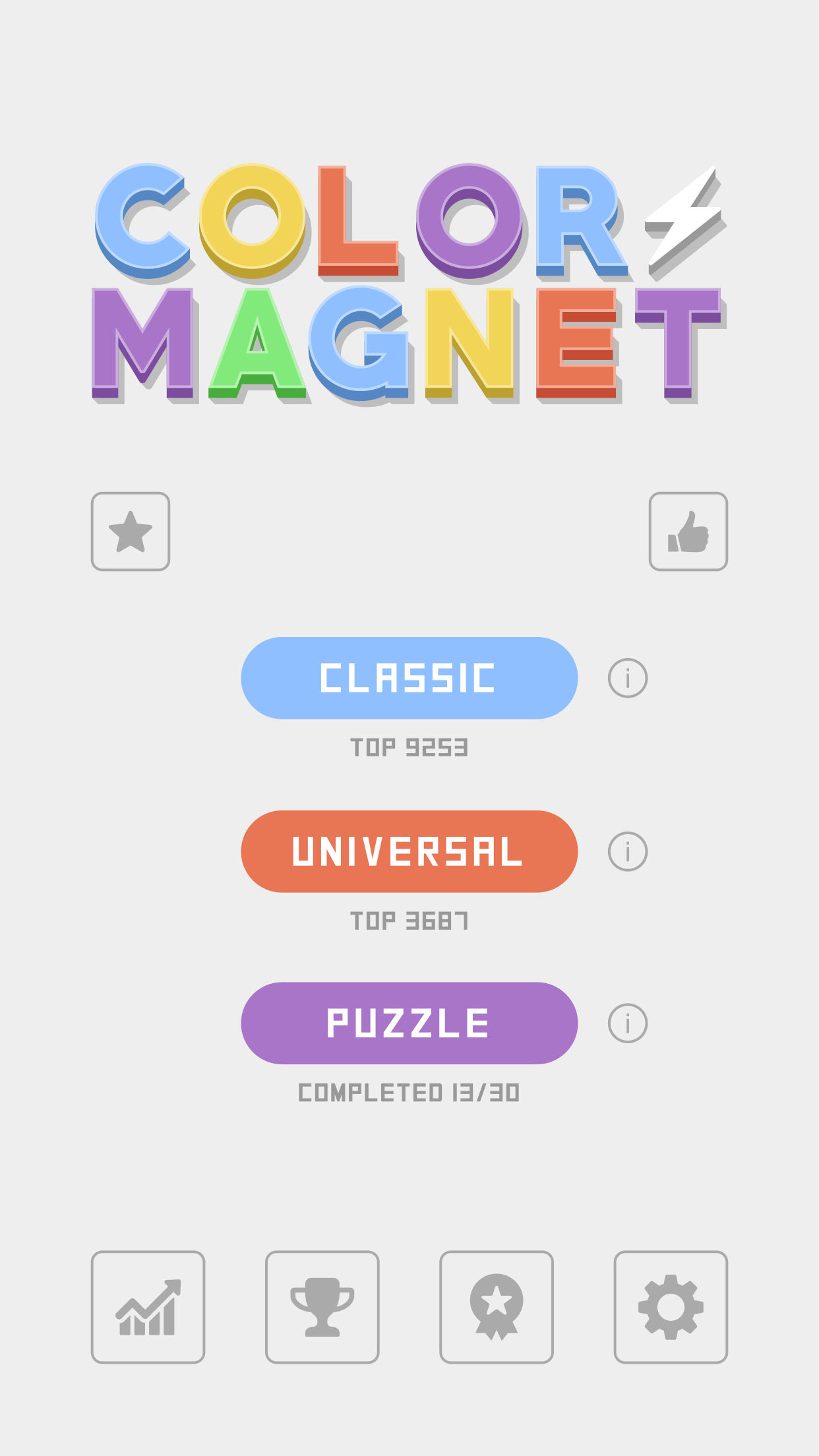 MoreColor Magnet is a simple yet defying and addictive puzzle game that challenges your brain and sharpens your mental skills. Shoot magnets to the board to attract blocks of the same color and get a combination of at least 5 to make them pop. Only the closest blocks in the same row and column will be pushed. Whatever you do, just remember: don’t let the blocks reach the bottom! Relaxing and minimalist, with a clean and polished design, Color Magnet puts your puzzle skills to the test with its unique gameplay and clever concept. Think strategically and be wise… It’s entirely up to you to become a truly Color Magnet Master! • THREE GAME MODES Try to beat your high score in Classic or challenge the world in Universal, where everybody plays the same sequence each time. If you’re willing to tease and dare your brain, try to clear the board across all levels in Puzzle! • DAY AND NIGHT COLOR MODES Choose between a lighter style and a darker one, each suited to a specific time of your day. • LEADERBOARDS Compete with your friends and the whole world, and prove that no one plays Color Magnet better than you! • ACHIEVEMENTS Unlock the amusing and challenging achievements that Color Magnet has prepared for you! Come play and enjoy! Follow us F: facebook.com/topcreativestudio T: twitter.com/theonepixelcs I: instagram.com/theonepixel
