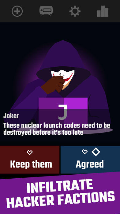 Lebih banyakYou’ve gone Rogue and the world is overrun by four hacker factions. Your decisions and hacking skills will keep the balance of power between them all ***Powerful Decisions*** Every decision matters. Your choices control which factions remain in power, who will go to war, create alliances, or remain at peace. You may have gone Rogue, but all the factions rely on you to get things done. Choose your own path as your decisions affect how the dynamic story unfolds. The branching stories constantly change depending on your decisions and who remains in power. But beware; every decision might have implications in the future that may dangerously shift the balance of power. It’s game over if a faction gains absolute control or loses all their power. ***Fast-Action Hacking*** Hack into rival factions’ computer systems with your ever expanding loadout of hacking powers. Hack into the deepest systems with simple one tap controls, while unleashing devastating powers with the push of a button. Features - Branching story depending on your decisions - Fast-Action Hacking - One tap controls - Upgradeable hacking powers
