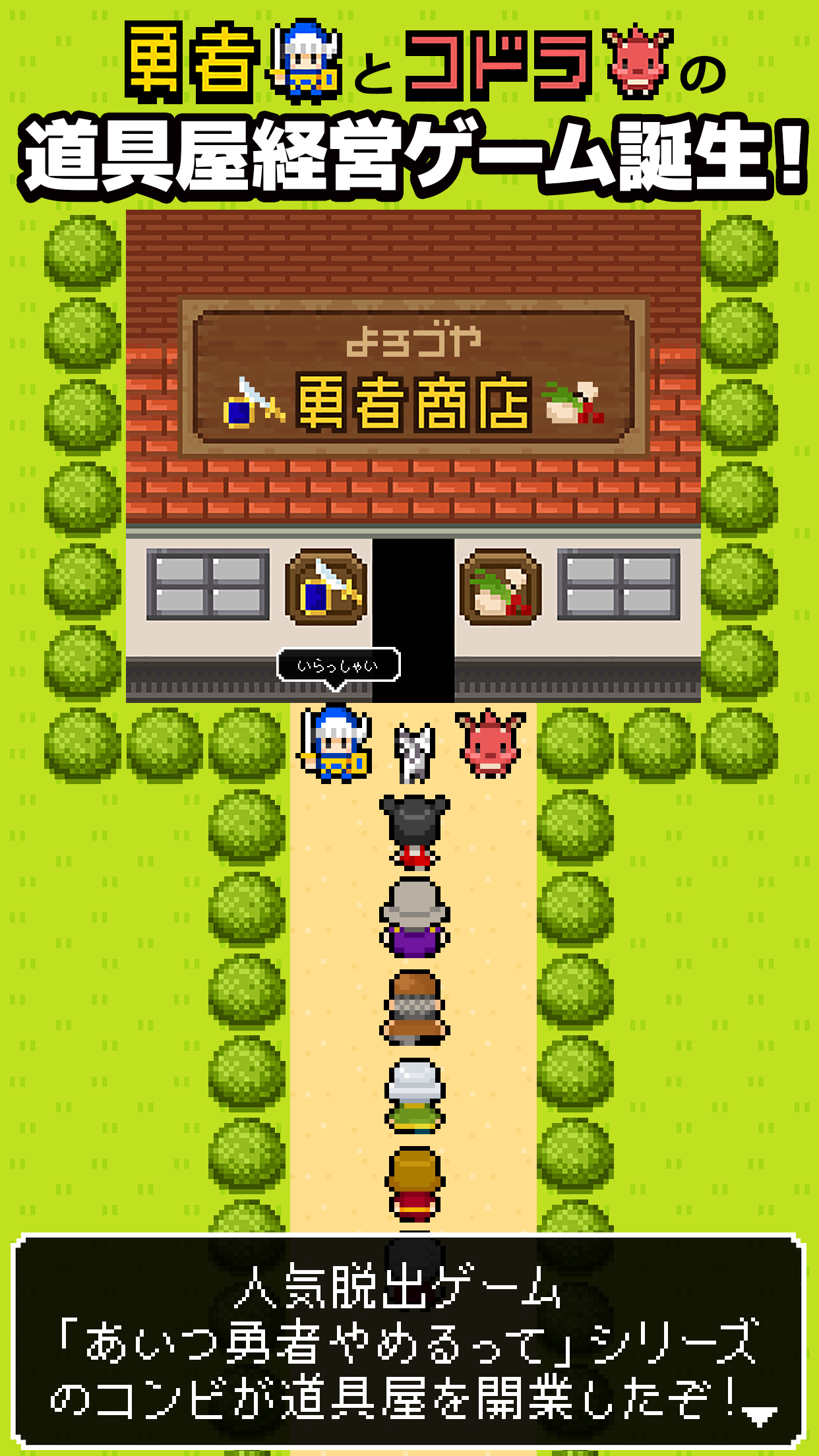 Lebih banyak元勇者とコドラのお店経営シミュレーションゲームです。 世界は平和になった! おれは勇者をやめた! そしてお金がなくなった! きづけばニート! 勇者として世界を救って、王様にほうびをもらう以外の仕事なんて知らない・・・! そのとき、ともに世界を救ったコドラは言った! 「勇者、お金をかせぐぞ! ポテチを売るぞ! 勇者、イモを掘る、 コドラ、火を吹く! 完璧だ!」 こうして、勇者は新たなる職業へと、踏み出していくのであった。 ▼まずは素材を集めよう 採集で様々なアイテムを集めましょう! 野生動物は地味にHPをけずってくるので気をつけて! ▼素材をつかって研究しましょう コドラの工房で素材を組み合わせて商品を生み出しましょう! 街の人と話してみたり、採集の途中で隠しレシピを見つけるかも!? ただひたすら己の勘を信じて研究してみるというのもありかもしれません。 ▼商品ができたらお店に並べて売りましょう! 棚の上に商品を置いたら、お客さんが来るのを待ちましょう。 コドラが店番をしててくれるので、さらに採集にでかけることもできます! ▼街を散策してみよう 街の人たちと話してみたり、お店を拡張する家具を買ってみたり。 お店が大きくなって勇者の信用が上がると、 他のエリアに行くビザも買うことができます。 さらに採集エリアを広げて、様々な素材を手に入れることができます! ▼商品開発ヒント カキンさんのひとりごと「ボクはこうみえてほんのちょっとだけひねくれているからね。いったことをぜんぶすなおにくみあわせたらダメだよ。」