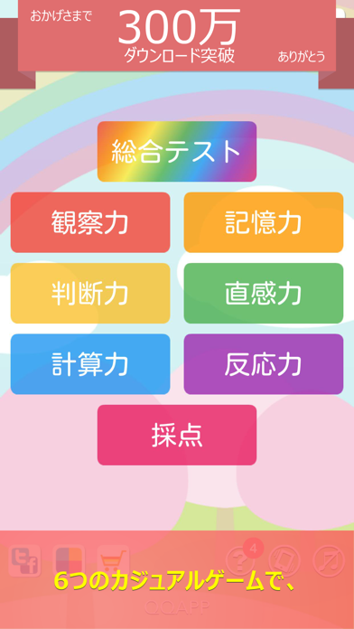 もっとシンプルで簡単な6つの脳トレゲームが収録されたゲームアプリ 収録されているゲーム ●観察力 1から25までの数字を順番にタップ ●記憶力 0から9までの数字を揃える ●判断力 表示される【文字の色】を答える ●直感力 ピッタリ指定された秒数を計測 ●計算力 小学生レベルの計算問題 ●反応力 じゃんけんで勝ち、負け、あいこを指示通りに選択 ●総合テスト 6つの脳トレを一度に挑戦、あなたの脳年齢を算出 ●本日のパズル 人気パズルゲームを続々登場 現在収録ゲーム:ミニナンプレ、クロスパズル、速算達人 定番の脳トレゲーム。個人差はあると思うが、どのゲームもだいたい30秒ぐらいで終わるので、ちょっとした合間にプレイできる。連続で6種類すべてのトレーニングを連続で答えていく「総合テスト」は、トレーニング内容が変わっても休憩がなく、次から次へと問題が出てくる。それをどんどんクリアしていると、何か脳から良い物質が出てくる感じがして、気持ちが良い。 操作的に難しいことは一切ないので、子供から大人まで幅広い層で楽しんでいただきたい。 脳ドリル、脳トレーナー、脳育、脳鍛え、脳活 脳年齢を鍛えたい皆様。 どうぞお試しくださいませ!