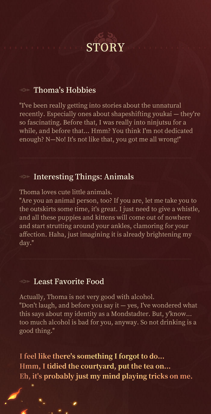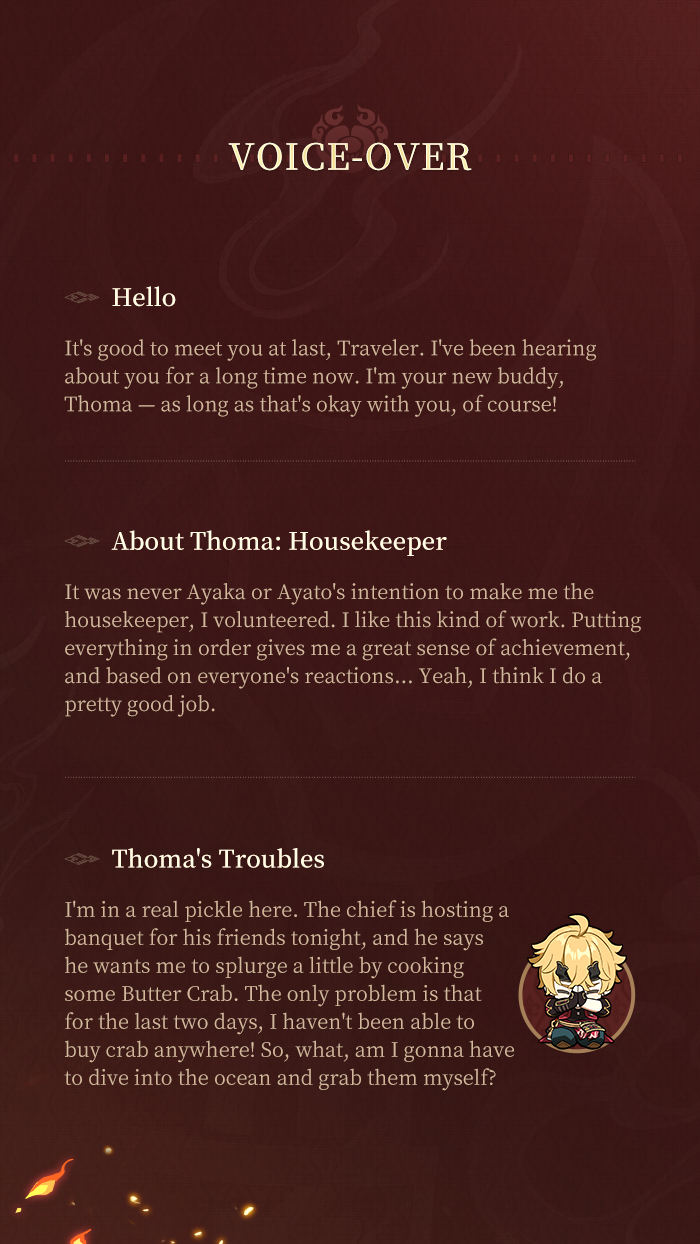 Thoma's official title in the Kamisato Clan is that of a "housekeeper," and he is responsible for matters such as cleaning and cooking.