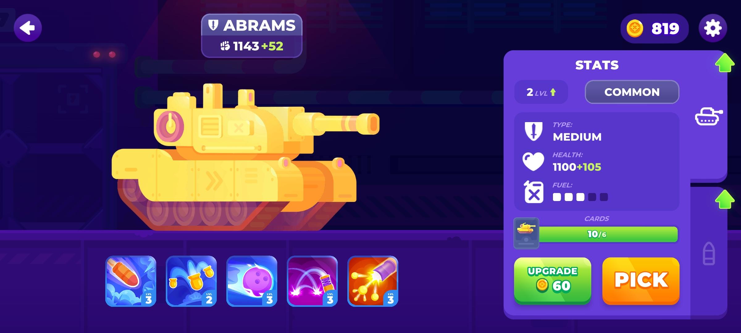 นอกจากนี้เมื่อจบแต่ละแมท เรายังสามารถสะสมแต้มจากชัยชนะ เอาไปเปิดกล่องเพื่อเอาไปพัฒนารถถังของเราได้ด้วย ซึ่งเมื่อเปิดกล่องเราจะได้รับการ์ด แบบสุ่ม ทั้งเป็นการ์ดรถถัง และการ์ดอัพเกรดปืน เมื่อทำการอัพเกรดรถถัง จะช่วยเพิ่มพลัง HP ของรถรถของเราให้มากขึ้น และจะเพิ่มพลังน้ำมันให้กับรถถังของเราด้วย ซึ่งพลังน้ำมันนี้จะช่วยทำให้เราสามารถเคลื่อนที่รถถังของเราในการไปข้างหน้าหรือข้างหลังได้มากขึ้น
