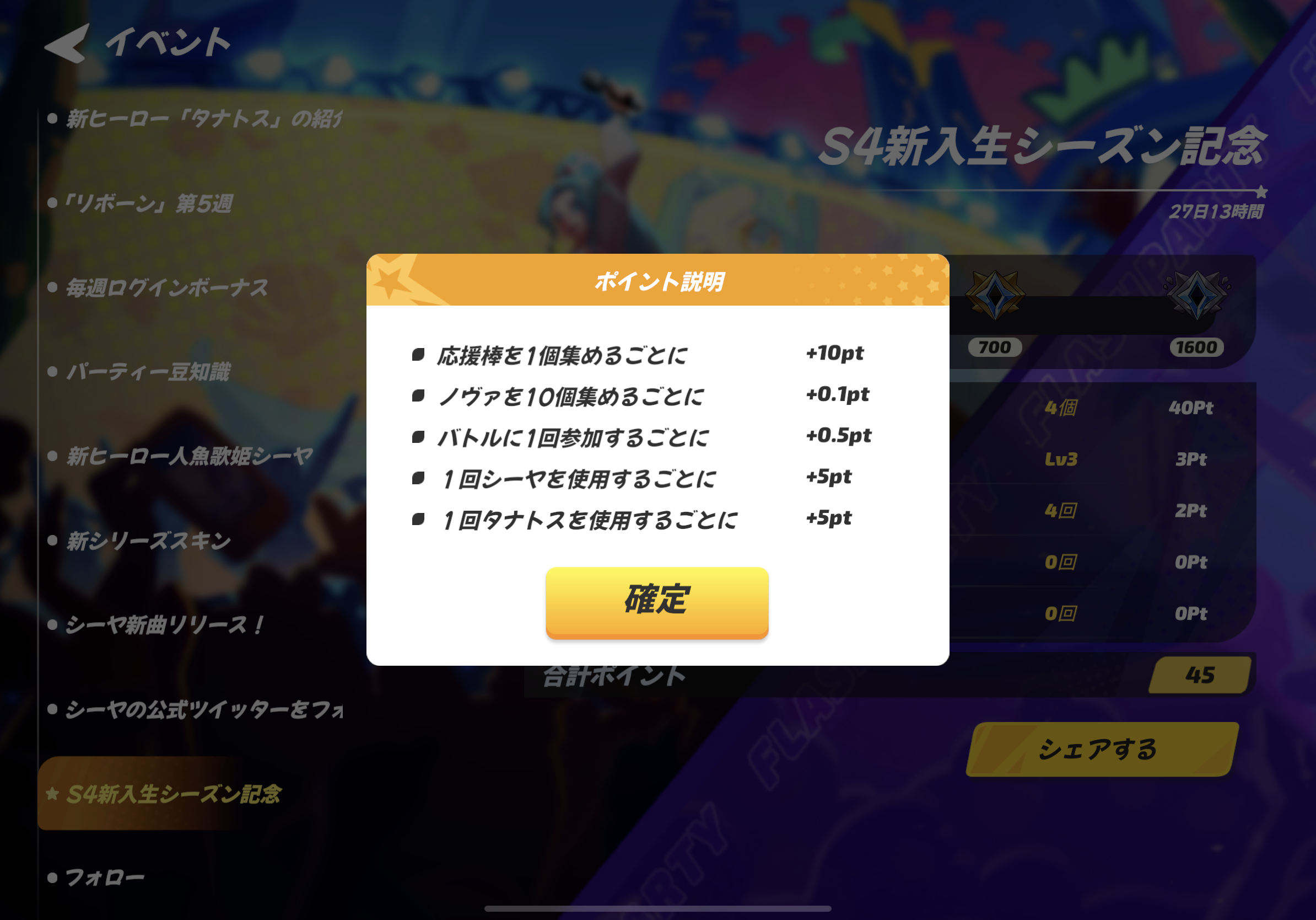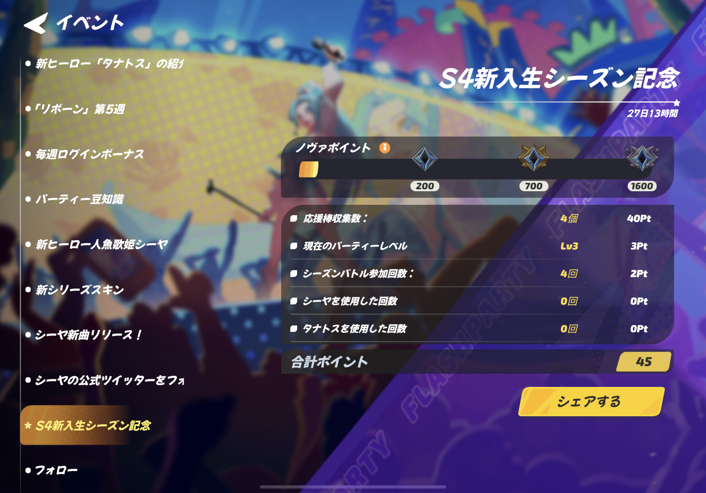 このような面白い体験はもちろんシェアしないと損ですよね。イベント画面の右下に「シェアする」ボタンを設定しました。このボタンをタップすると、シーズンの進捗と獲得した最高記念ノヴァをフレンドにシェアできますよ~