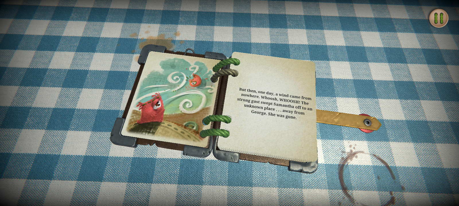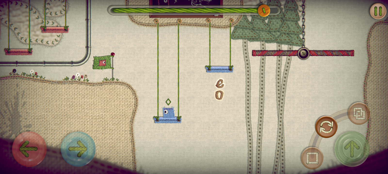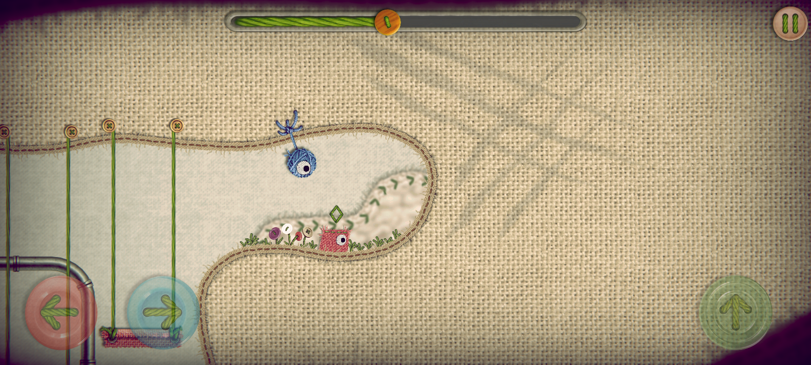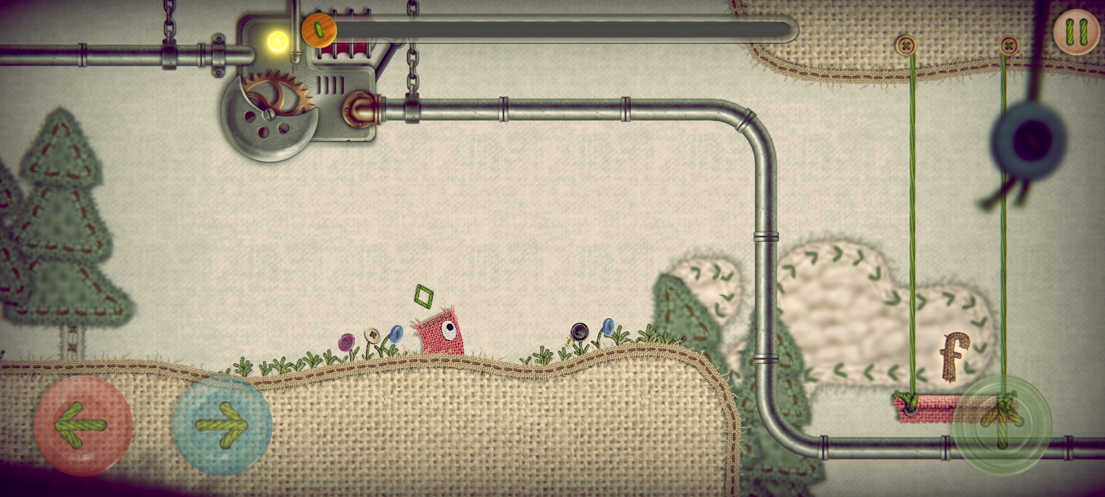 Where’s Samantha? tells the story of George and Samantha, two swatches of fabric who are head over heels for each other. They’re inseparable—that is, until a sudden gust of wind blows Sam away, and George has to go on a dangerous adventure into a strange realm in order to try and bring her home. This new world is a place full of saw blades, moving platforms, lasers, spikes—all the typical tropes that a puzzle platformer throws at you, but given a homespun twist as the spikes are made from screws and combs and the platforms from pencils tied to wooly pull strings.