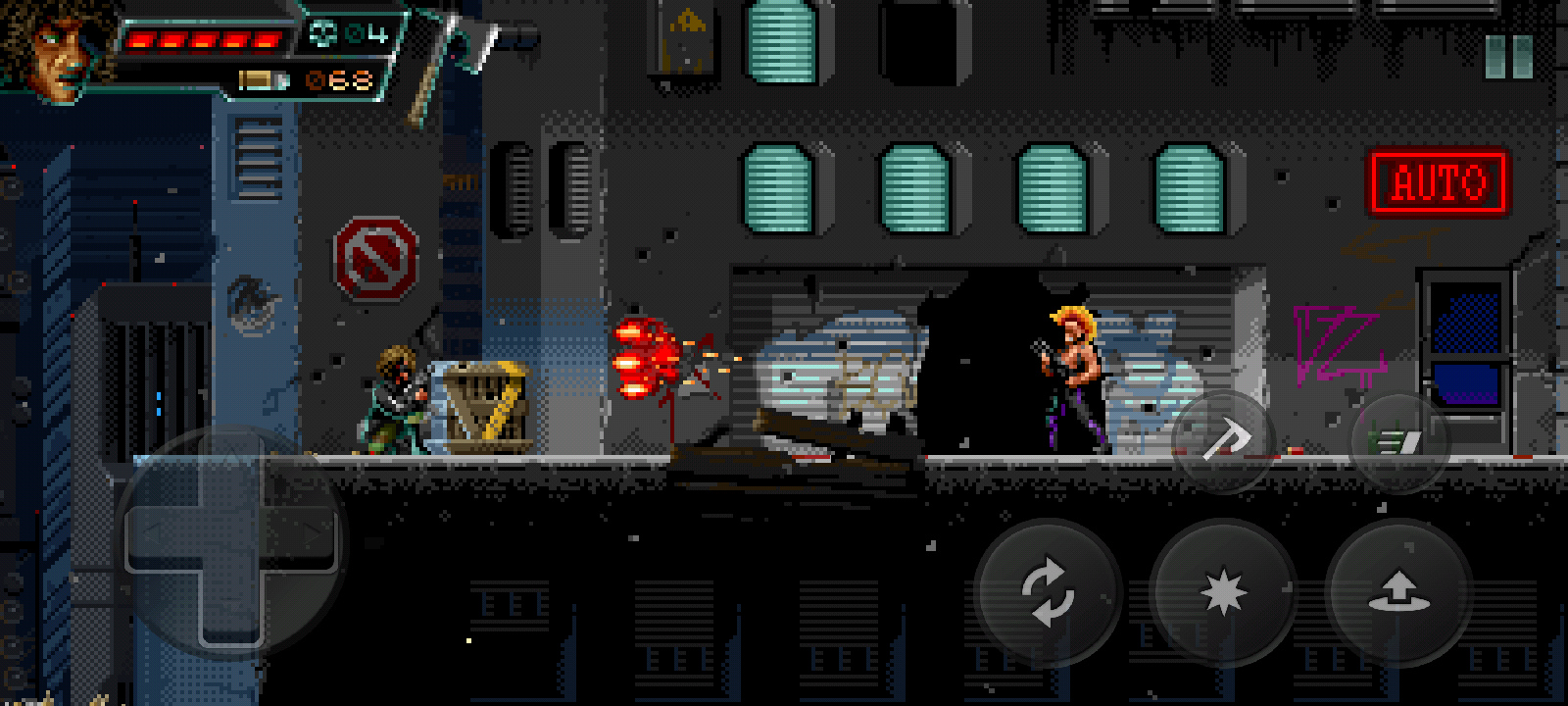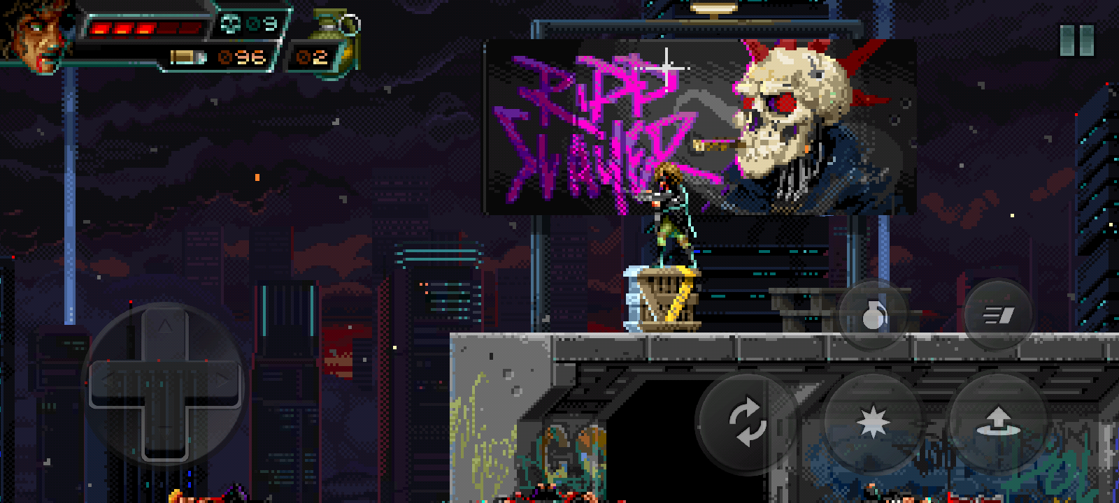 Perfect, linear mazes are the focus of what Huntdown has to offer in terms of gameplay. Sure, this formula is simplistic and cut down to the bone, but it is so effective that I barely even saw it as a shortcoming. You can run, jump, and shoot as is in most classic 2D side-scrolling shooters, with the addition of a side shot, which is essential to avoid the fanning of enemy bullets.