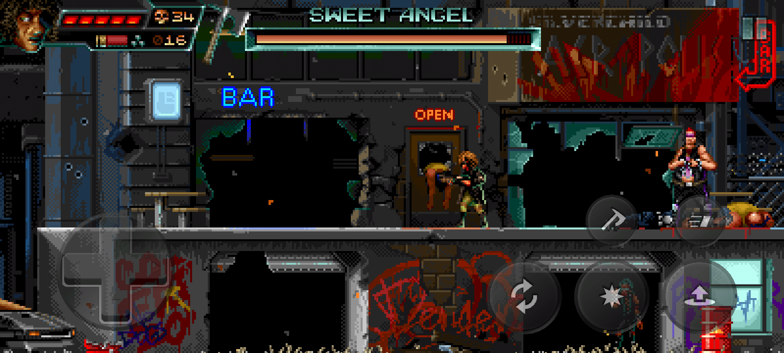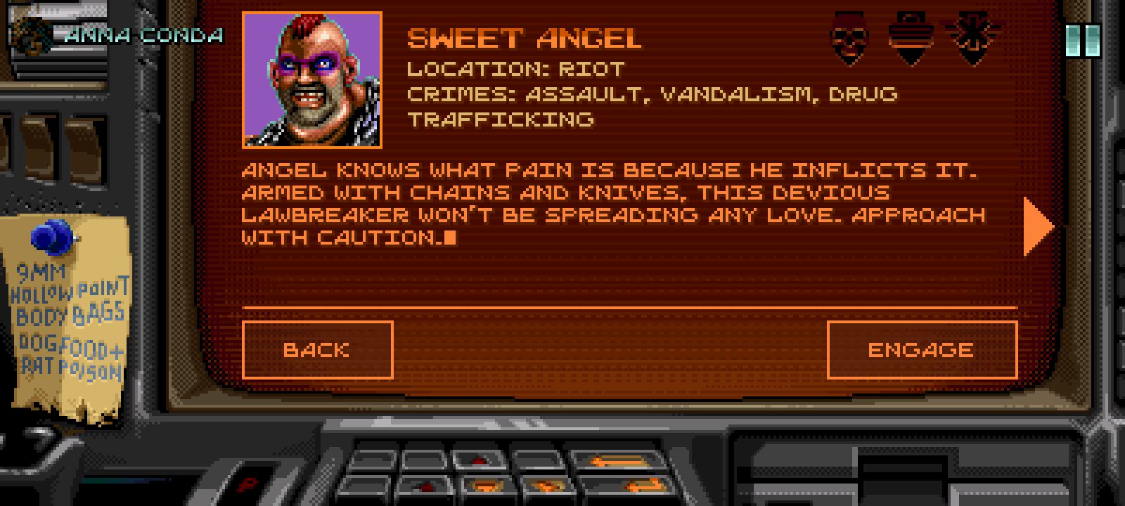 Huntdown follows three bounty hunters—Anna Conda, John Sawyer, and Mow Man—hired by the police to end the domination of four rival gangs scattered across four neighborhoods of the futuristic city in which I find myself. Our three heroes seem to have teleported directly from the films of the decade that inspired the game. They would look right at home as partners of Snake Plissken, popping out of some trash-strewn alley in the aforementioned Blade Runner, or taking on the villains of the oft-overlooked The Running Man.