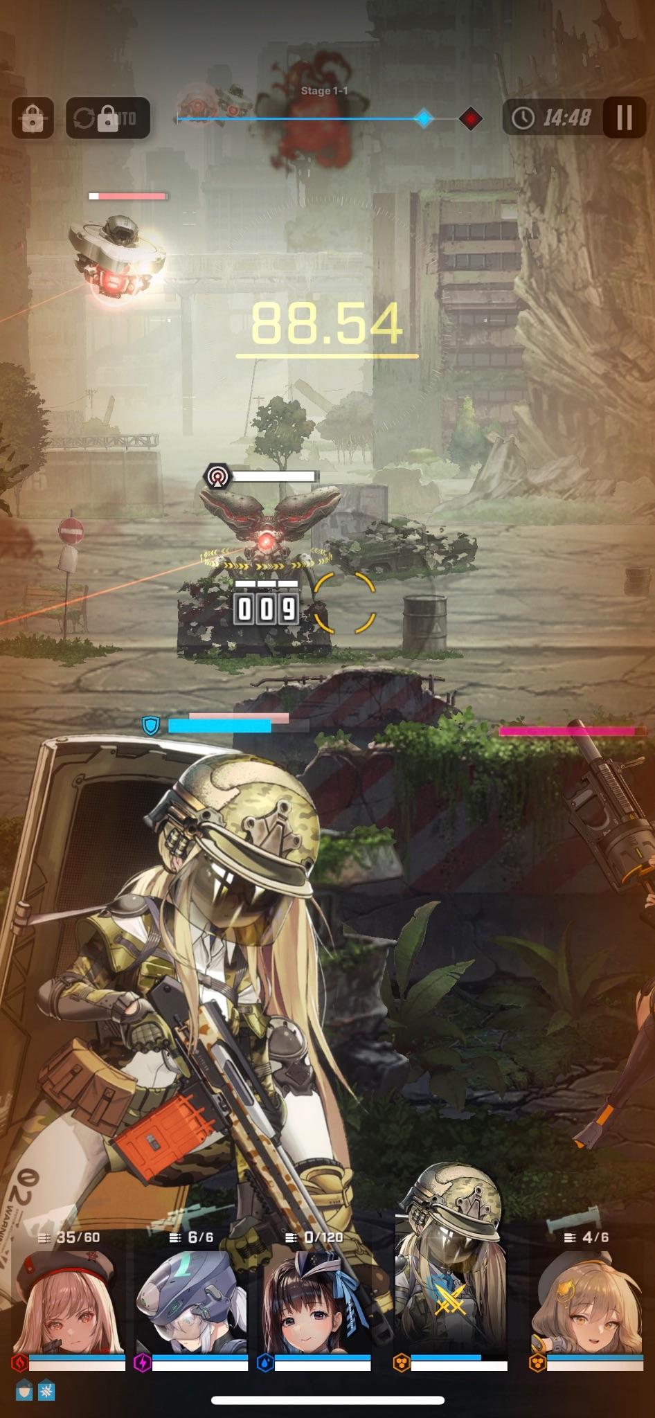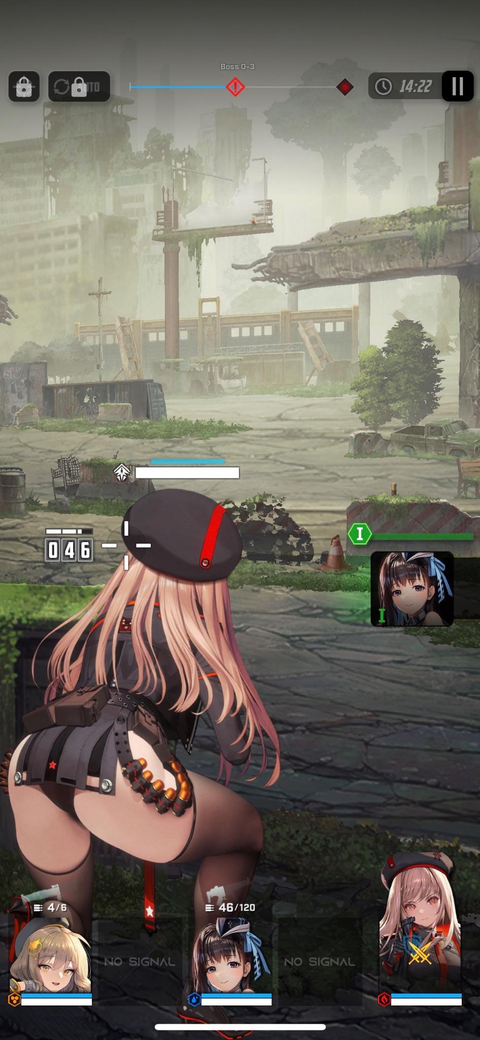 • Combat. If the visuals alone aren’t enough to hook you in, the combat should be! Nikke’s third-person shooting rewards players who have good aim, but it also includes some minor auto assist if you’re terrible at this sort of thing. Each character has special moves known as “burst skills,” which kick the battle up a notch. And by adding more members to your squad, you can create greater diversity in the combat roles and in your strategic options. It was really fun alternating between machine guns, rocket launchers, and sniper rifles to take down a Blacksmith, the first boss I encountered.
