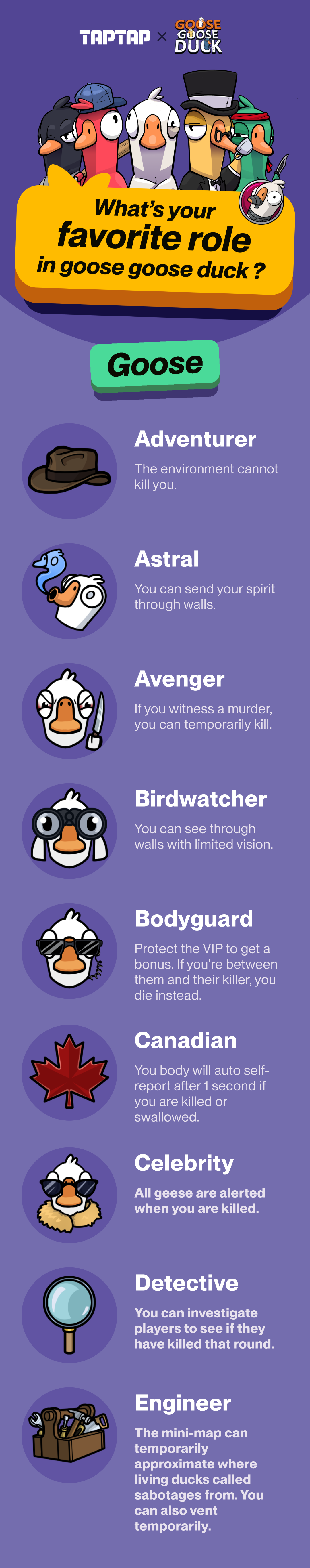 2. Nominate your favorite role (goose/duck) in Goose Goose Duck and tell us why you like it. You can also include your review or suggestions for the game in your submission.