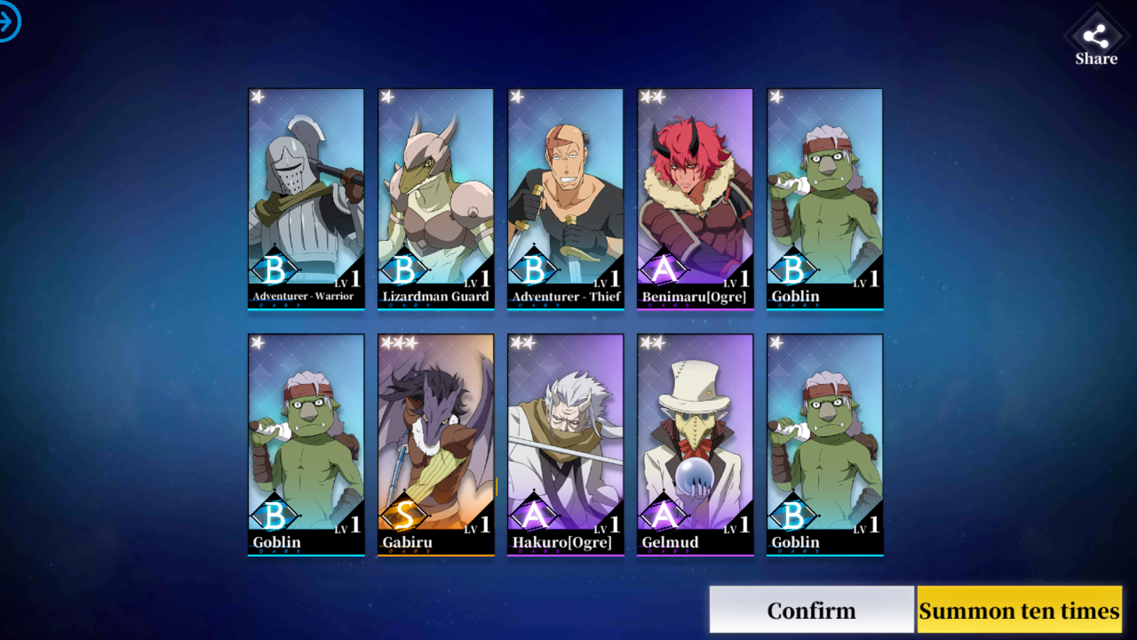 And while the odds of getting S-ranked characters are low like FGO, the depth of the Gacha isn’t as good. While Fate/Grand Order has a huge pool of characters to add into their gacha mechanics, I find Tensura to be quite lacking. While the original light novels, manga, and anime does indeed have lots of named characters, it does not show in the game that much. Mostly, you will get different versions of the characters, such as the Ogre version of Shion and the S-Ranked Kijin version of the character. If you try to summon, you would mostly just get B-Ranked unnamed generic characters such as “Goblin,” “Orc,” “Lizardman,” or “Adventurer,” along with the occasional A-ranked named characters like Ogre Hakuro and even villains like Gelmund. And like most Gacha-type games, getting a ton of nameless generic characters instead of the ones you came to love in the anime is quite frustrating.