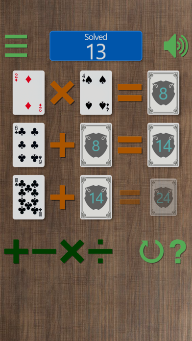 БольшеChallenge yourself everyday.! The Poker24 Game is an arithmetical card game in which the object is to find a way to manipulate four cards used as integers so that the end result is 24. HowToPlay: 1. Ace, 2-10, Jack, Queen and King represent 1 to 13 respectively.You win if you can compute 24 with the 4 cards. 2. For an example card with the numbers 4,7,8,8, a possible solution is the following: (7-8/8)*4=24. To play this game, Mental arithmetic and fast thinking are necessary skills for competitive play. Pencil and paper will slow down a player, and are generally not allowed during play anyway. "The 24 game has been played in Shanghai since the 1960s, using ordinary playing cards. Robert Sun commercialised the game and copyrighted it in 1988, introducing dedicated game cards bearing four numbers each". Train mode and Challenge mode give you professional guide.