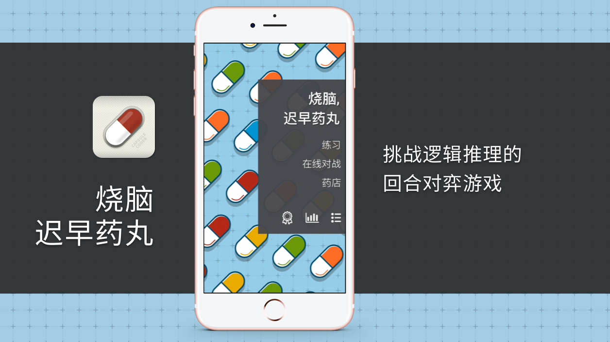 เพิ่มเติม『烧脑,迟早药丸』是一个回合制双人对弈游戏. 适合对推理能力有自信的玩家挑战智商. 游戏玩法源自传统游戏珠玑妙算(又称猜数字, 1A2B), 但增加了原创的回合制对战模式和道具. 游戏目标是在对手之前找到"解药". 游戏过程中双方轮流猜测并且获得线索. 根据线索推理出正确的解药. 有趣的部分是, 你可以看到对手的猜测组合, 但是除非使用道具, 否则看不到他的线索; 而双方每一次猜测都可能成为对手获胜的跳板. 猜数字的爱好者可能对于单人游戏的致胜方式已经熟悉, 但是『迟早药丸』的原创对战玩法有更多变化和博弈性, 如果传统单人玩法已经无法满足你挑战智商的需要, 那就邀请好友一起来烧脑吧! 还可以在获胜之后在朋友圈炫耀你的战绩! 【玩法说明】 === 目标 === 在对手之前找到正确的胶囊组合(无重复颜色, 由电脑随机生成, 所谓“解药”) === 过程 === 1. 邀请朋友或自动寻找对手开始游戏. 自动寻找对手时, 你可能创建一个新游戏或者加入别人创建的游戏中. 创建游戏的人先开始回合. 2. 在你的回合, 从屏幕下方的胶囊中选择组合为“解药”. 3. 点按已经选择的药片, 可以取消它重新选择. 4. 为四个位置都选择了药片后, 点按OK确认. 5. 电脑将用四个图标显示你的“解药”是否正确: a) 每个 "√" 表示有一个药片放在了正确的位置; b) 每个 "?" 表示有一个药片存在于解药中, 但放在了错误的位置上; 注意:在一个组合中, 如果某个药片已经在正确的位置上("√"), 那么在另一个位置放置同样的药片并不会被提示为"?". c) 经过(a)(b)筛选后, 剩余的药片表示为"x". 6. 你和对手轮流猜测, 先获得四个 "√" 的人获胜. === 道具 === 2.0版本开始加入的三种道具, 让对战有更多乐趣和对抗性. 由于使用道具时对手并不会察觉, 所以是否拥有道具和使用道具的时机是获胜的关键. 三种道具的功能分别是: 药方: 预知解药中的任意位置的正确药片; 听诊器: 偷看对手任意回合的线索; 创口贴: 阻挡对手看到他自己下回合的线索; 道具除了首次赠送的之外, 可以通过在练习中找到解药赢取金币购买 === 规则 === - 有效的游戏将会计分. 有效的游戏是 * 进行了至少一个回合的游戏(每个玩家选择一次解药为一个回合) * 玩家第一次选择就找到解药的游戏 - 比赛限制在30个回合(每个玩家可以选择30次), 如果限定回合内没有人找到解药, 则为平局. - 任何一方在有效游戏结束前放弃或删除游戏, 将被判定落败. - 任何一方在轮到他时未作回应超过1小时, 游戏控制权将交给另一方. 另一方可以马上宣布胜利或者继续游戏. 如果继续游戏, 时间限制将重新计算. - 计分 找到解药: 20 ~ 200. 使用回合越少越高分. 宣布胜利/对手退出: 10 平局: 5 === 练习 === 在挑战朋友之前, 你可以在练习模式中熟悉游戏玩法和获取金币. 找到解药使用回合越少, 获得的金币越多, 金币可以用于在药店中购买道具. 【游戏提示】 1. 你可以选择猜测和对手一样的胶囊组合来了解他的线索. 注意越晚这样做, 落败的风险越大. 2. 如果你一开局就选到了有很多[√]和[?]的胶囊组合, 你在随后几步可以故意使用错误的胶囊来避免对手发觉正确的胶囊 3. 在使用道具偷看对手的线索作为自己的参考时, 也要防止已经十分接近胜利的答案被对手利用. 4. 找到解药时使用回合越少, 获得金币或得分越多, 所以练习中如果发现使用药方可以更早找到解药, 是值得一用的.