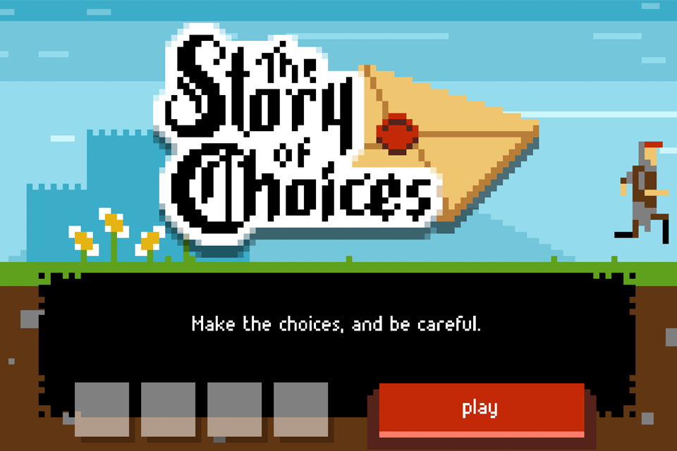 更多The Story of Choices has a very complex story line, with multiple paths and endings, based on small decisions, such as "wake up" or "snooze" a little while longer. Our hero, named Choices, needs to avoid war between two kingdoms as he works as a messenger between the two kings. Make him choose wisely, and you could even get the princess to marry him. - Multiple Endings - Find out all possible outcomes - Endless Replayability - Envolving Story - Game created in a 36 hour game jam